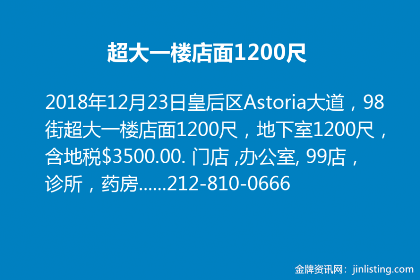 皇后区Astoria大道,98街超大一楼店面1200尺,地下室1200尺,含地税$3500.00. 门店 ,办公室, 99店,诊所,药房,美容院,货运,仓储等。。。。。适合各行业。电:212-810-0666,薛小姐