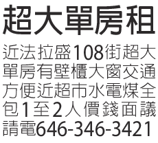 超大單房:近法拉盛108街有壁櫃大窗交通方便近超市水電煤全包1至2人價錢面議。電646-346-3421