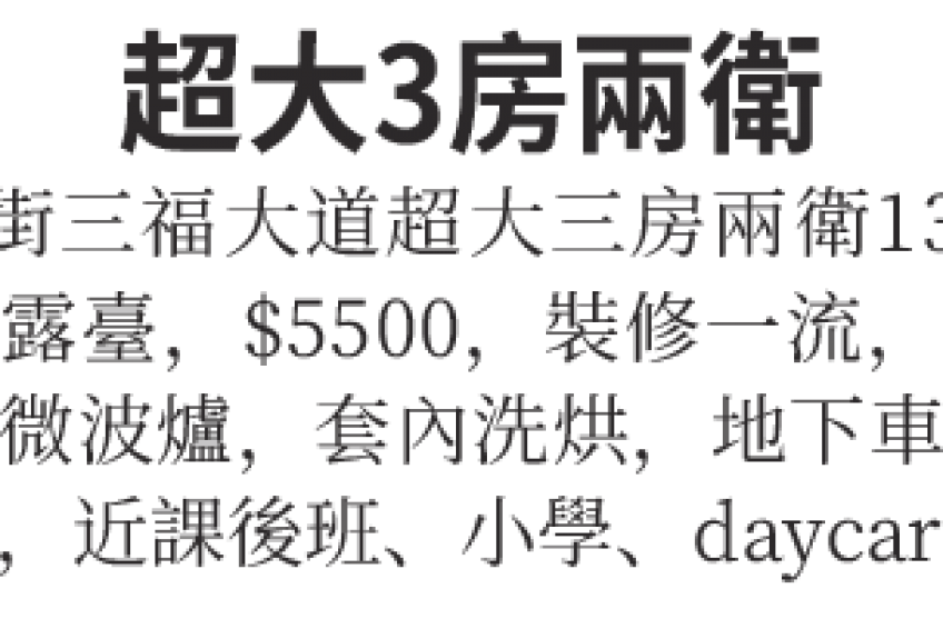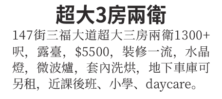 法拉盛租—147th st & Sanford Ave,超大三房两卫1300+尺,露台238尺,$5500