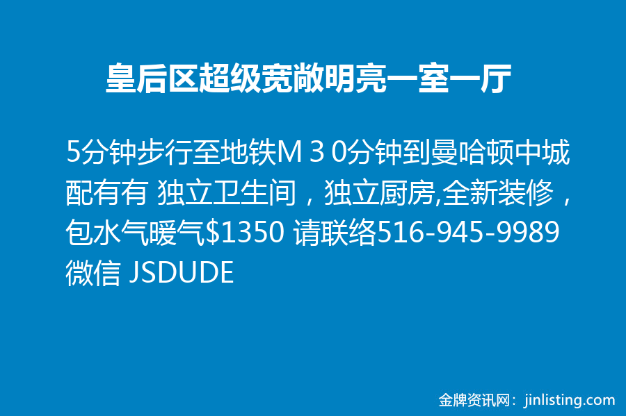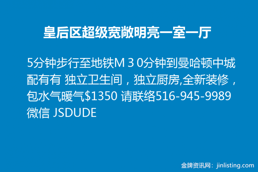 新房位于QueensRidgewood,治安好,安静,生活方便,周围有各种超市,餐馆,体育馆YMCA,篮球场. 近地铁M车,走路1分钟,L train 7 mins walk, 20分钟到soho, cityhall, 30分钟到曼哈顿中城。一室一厅光线,配有有 独立卫生间,独立厨房,全新装修, 包水气暖气$1350。7月1入住。地下室还有洗衣机烘干机可方便使用。 有意者请联络516-945-9989,or add weichat JSDUDE. This is ideal for PACE, NYU, and Baruch students, the M train from Fresh PondStation (3 blocks away) takes only 20 Minutes to Manhattan and 30 minutes on Ltrain to union square, 10 min to williamsburg.