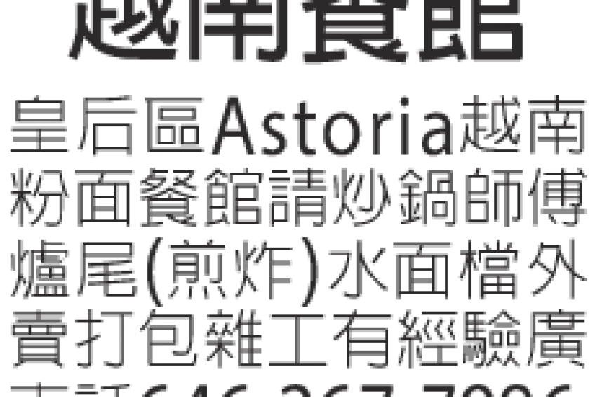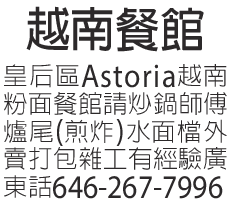 皇后區 Astoria 越南粉面餐館,廚房請 炒鍋師傅 ,爐尾(煎炸),水面檔 , 外賣打包和雜工。有經驗,廣東話爲佳,全職或兼職