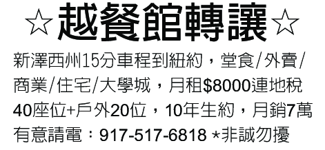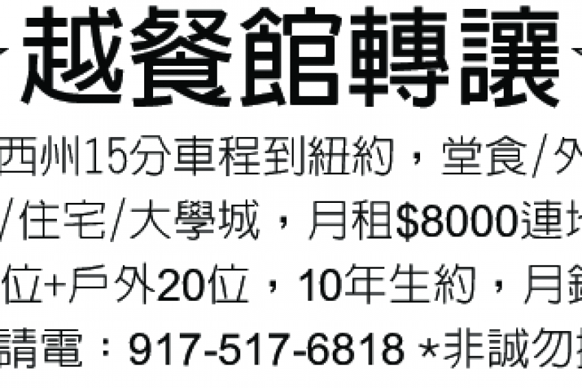 *越餐館轉讓* 917-517-6818