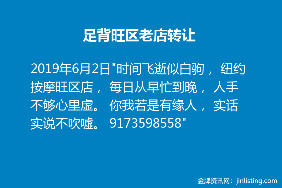 足背旺区老店转让 “时间飞逝似白驹, 纽约按摩旺区店, 每日从早忙到晚, 人手不够心里虚。 你我若是有缘人, 实话实说不吹嘘。 9173598558”