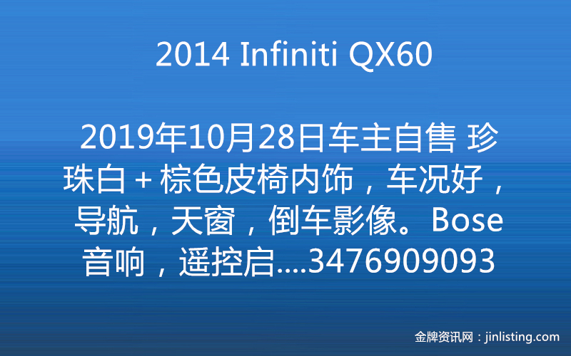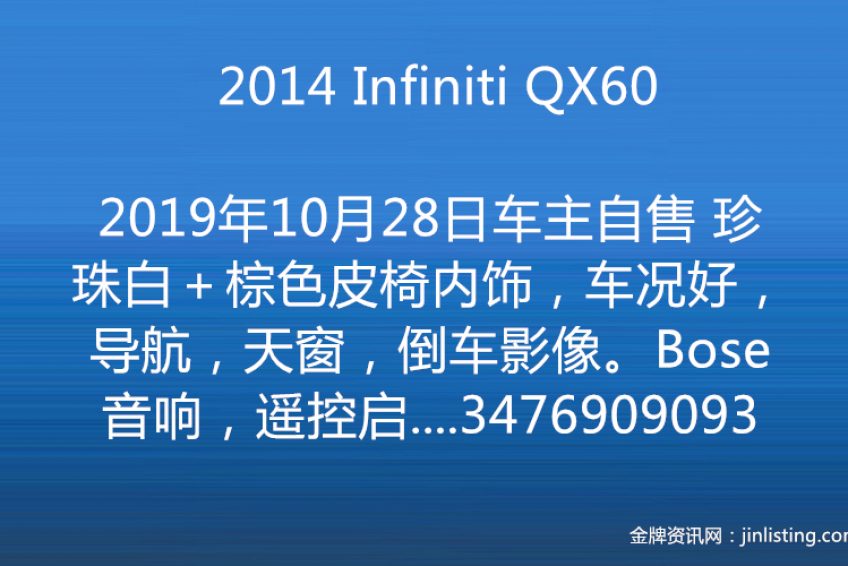 车主自售 2014 Infiniti QX60珍珠白+棕色皮椅内饰,车况好,导航,天窗,倒车影像。Bose音响,遥控启动,360度全景摄像头.,行李架和踏板都有……车在长岛,现在迈数4万多,价格$2W,车况好可以约法拉盛看车,有意请电3476909093王先生!