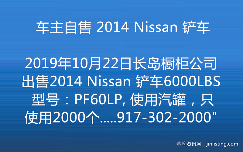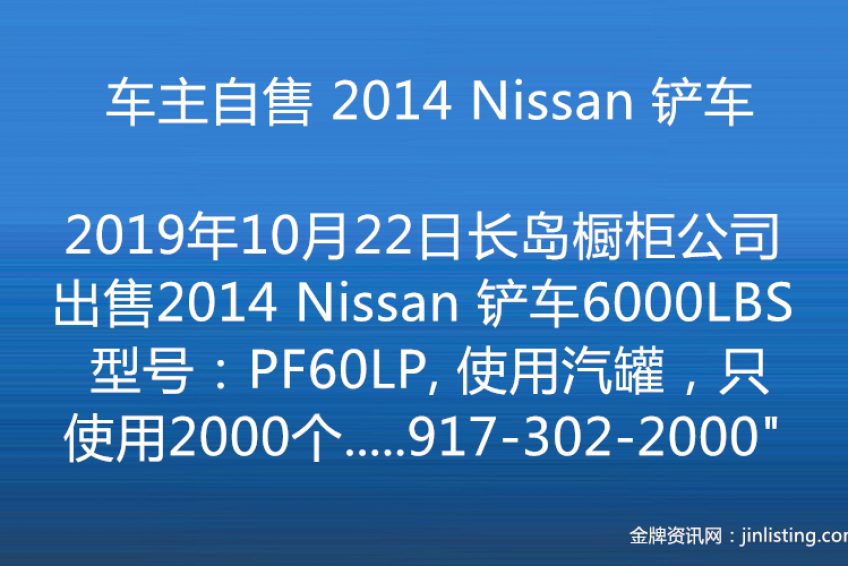 ***** 车主自售 2014 Nissan 铲车—— 6000LBS ***** “长岛橱柜公司 出售2014 Nissan 铲车—— 6000LBS 型号:PF60LP, 使用汽罐,只使用2000个小时。车况好,售价: $9990 有意请电: 917-302-2000”