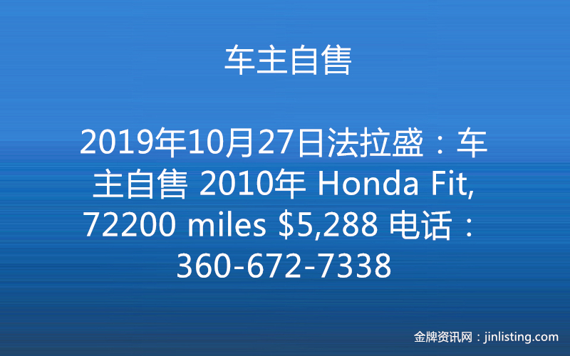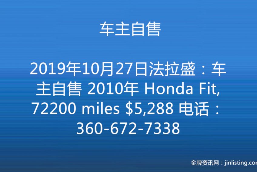 法拉盛:车主自售 2010年 Honda Fit, 72200 miles $5,288 电话:360-672-7338