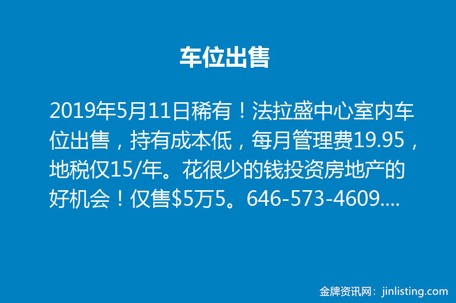 【车位出售】稀有!法拉盛中心室内车位出售,持有成本低,每月管理费19.95,地税仅15/年。花很少的钱投资房地产的好机会!仅售$5万5。 646-573-4609,微信同号