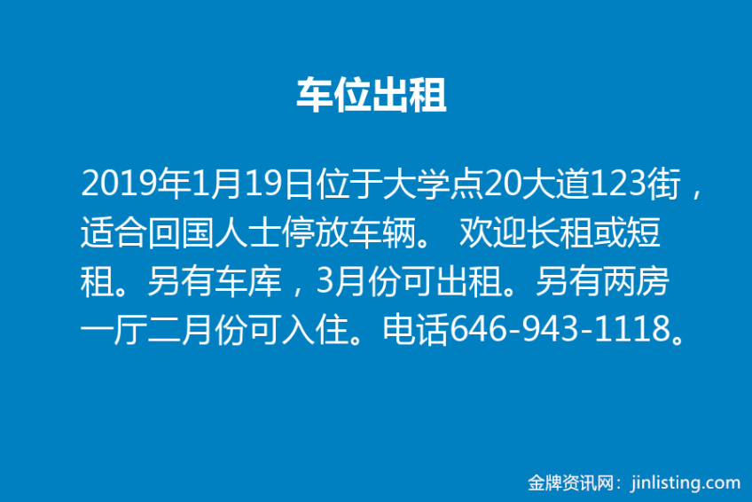 车位出租,位于大学点20大道123街,适合回国人士停放车辆。 欢迎长租或短租。另有车库,3月份可出租。另有两房一厅二月份可入住。电话646-943-1118。