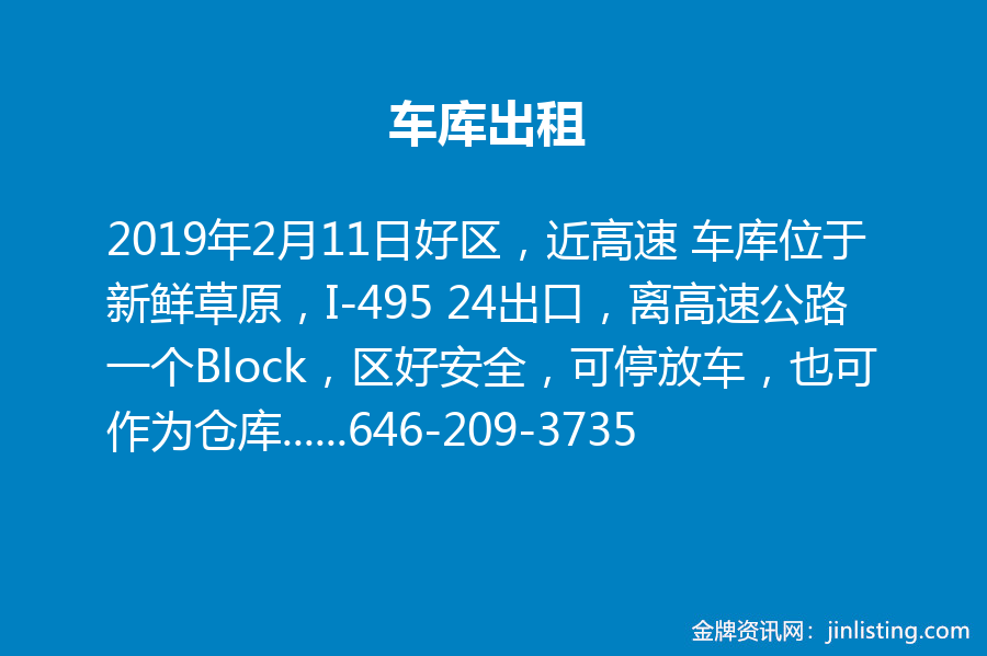 车库出租,好区,近高速 车库位于新鲜草原,I-495 24出口,离高速公路一个Block,区好安全,可停放车,也可作为仓库。3月份开始可用,有意者请联系646-209-3735