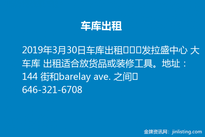 ☎车库出租☎️️发拉盛中心 大车库 出租适合放货品或装修工具。地址:144 街和barelay ave. 之间☎646-321-6708
