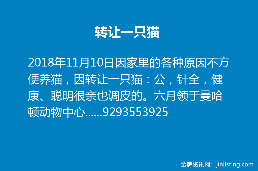 转让一只猫 因家里的各种原因不方便养猫,因转让一只猫:公,针全,健康、聪明很亲也调皮的。六月领于曼哈顿动物中心,手续费79.99,现猫,猫树,便屋,垫子,猫食等一起出100刀拿走。有意者请短信联系9293553925,照片到时给。