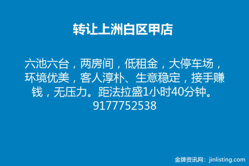 转让上洲白区甲店,六池六台,两房间,低租金,大停车场,环境优美,客人淳朴、生意稳定,接手赚钱,无压力。距法拉盛1小时40分钟。9177752538