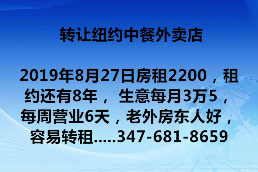 转让纽约中餐外卖店, 房租2200, 租约还有8年, 生意每月3万5, 每周营业6天, 老外房东人好, 容易转租, 欢迎来电咨询, 347-681-8659
