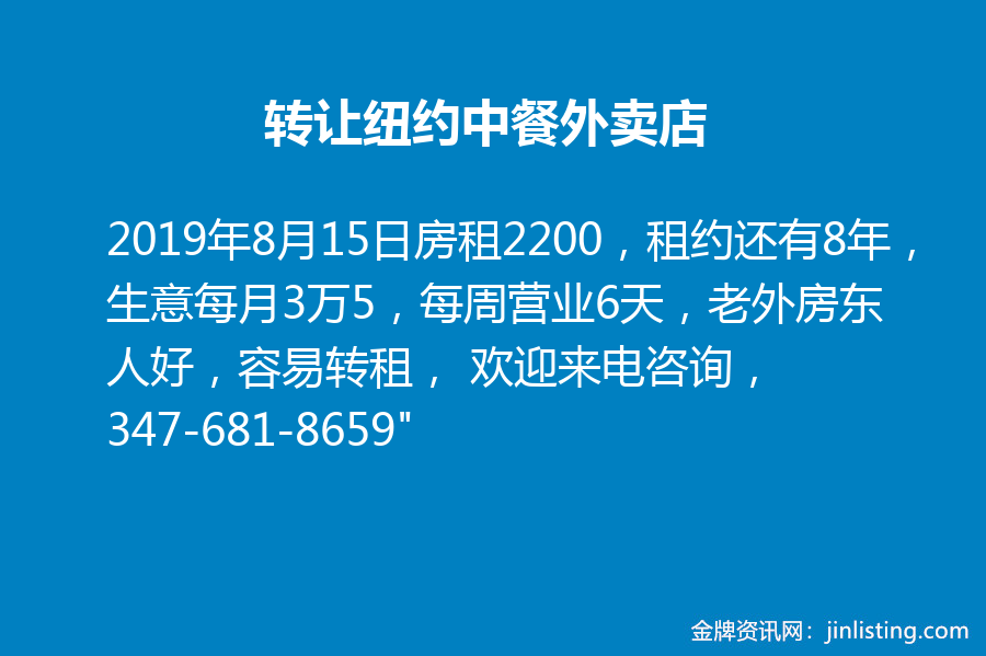 “转让纽约中餐外卖店, 房租2200, 租约还有8年, 生意每月3万5, 每周营业6天, 老外房东人好, 容易转租, 欢迎来电咨询, 347-681-8659”