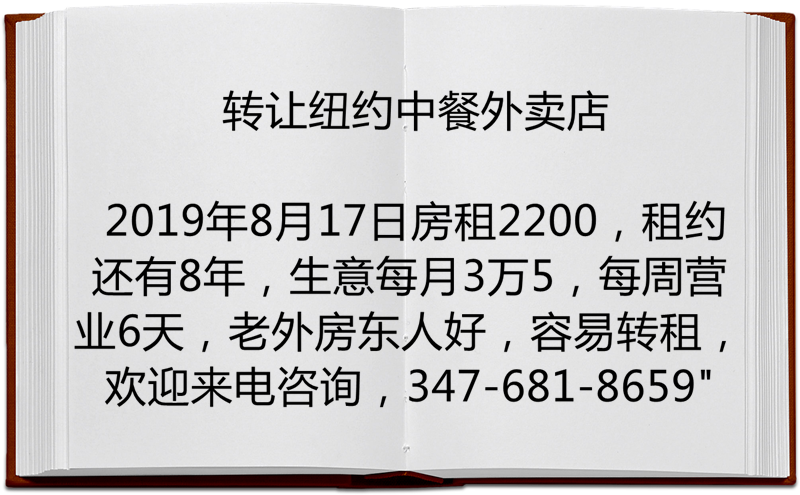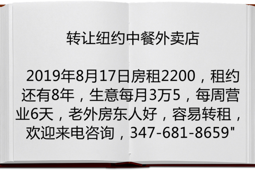 “转让纽约中餐外卖店, 房租2200, 租约还有8年, 生意每月3万5, 每周营业6天, 老外房东人好, 容易转租, 欢迎来电咨询, 347-681-8659”
