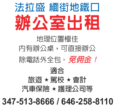 法拉盛面街地鐵口辦公室出租,地理位置級佳,內有辦公桌,可直接辦公,除電話外全包,適合:旅遊,駕校,會計,汽車保險,護理公司,免擁金!