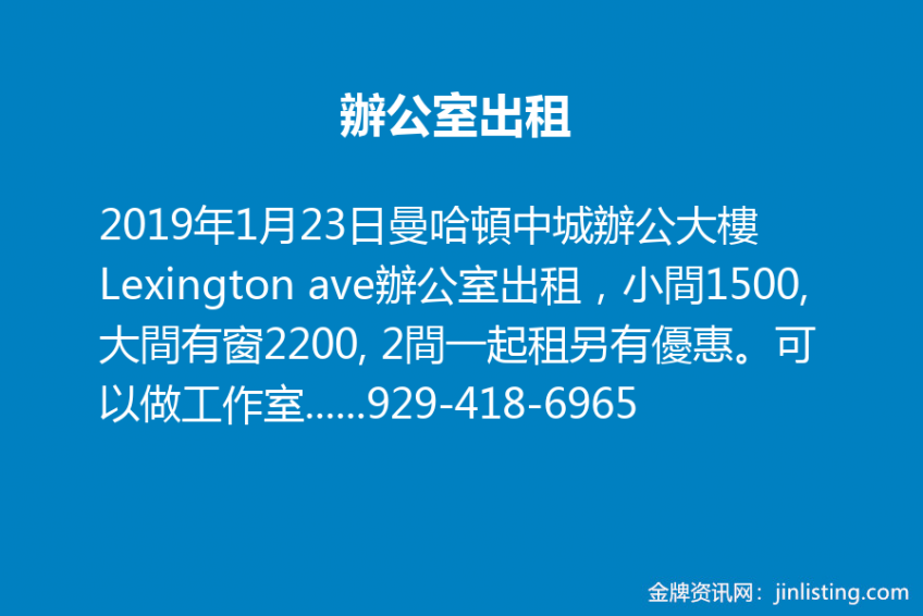 曼哈頓中城辦公大樓Lexington ave辦公室出租,小間1500, 大間有窗2200, 2間一起租另有優惠。可以做工作室,辦公室, 有廚房,廁所,包水暖電網路 ,有興趣者可電話諮詢 929-418-6965