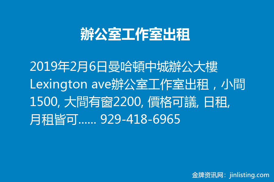 曼哈頓中城辦公大樓Lexington ave辦公室工作室出租,小間1500, 大間有窗2200, 價格可議, 日租, 月租皆可。2間一起租另有優惠。可以依照需求提供辦公用品或家具。可以做工作室,辦公室, 有廚房,廁所,包水暖電網路 ,電話諮詢 929-418-6965