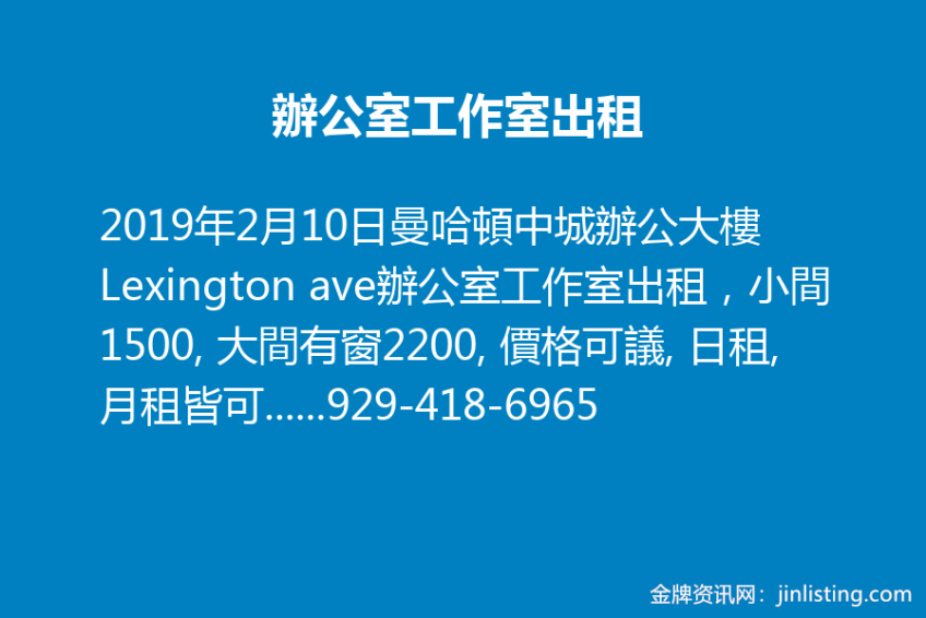 曼哈頓中城辦公大樓Lexington ave辦公室工作室出租,小間1500, 大間有窗2200, 價格可議, 日租, 月租皆可。2間一起租另有優惠。可以依照需求提供辦公用品或家具。可以做工作室,辦公室, 有廚房,廁所,包水暖電網路 ,電話諮詢 929-418-6965