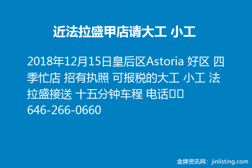 近法拉盛甲店请大工/小工 皇后区Astoria 好区 四季忙店 招有执照 可报税的大工 小工 法拉盛接送 十五分钟车程 电话☎️ 646-266-0660
