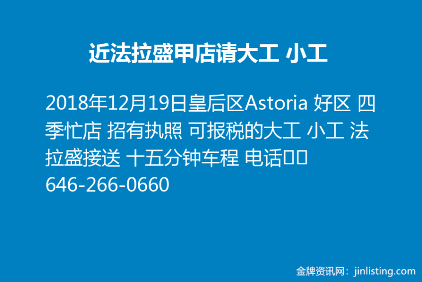 近法拉盛甲店请大工/小工 皇后区Astoria 好区 四季忙店 招有执照 可报税的大工 小工 法拉盛接送 十五分钟车程 电话☎️ 646-266-0660