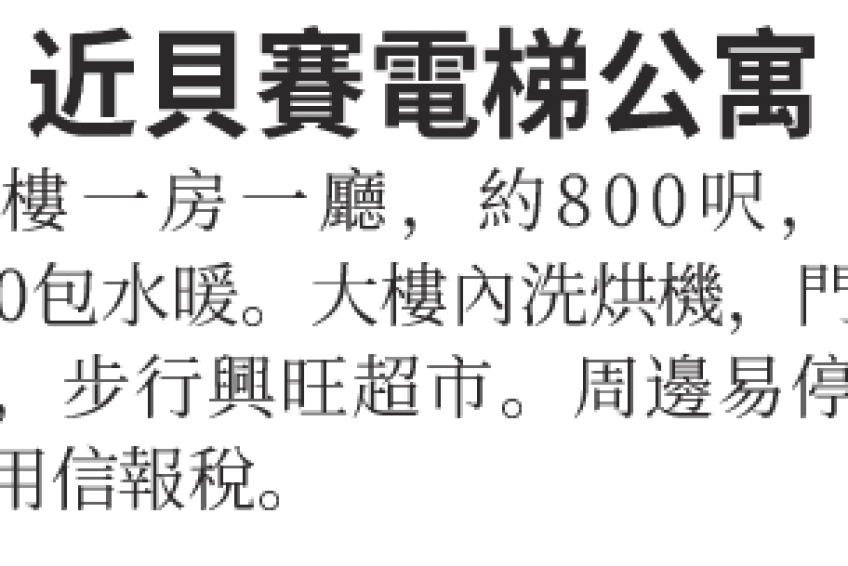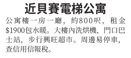 四寓楼一房一厅,约800尺,租金1900包水暖。大楼内洗烘,