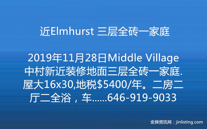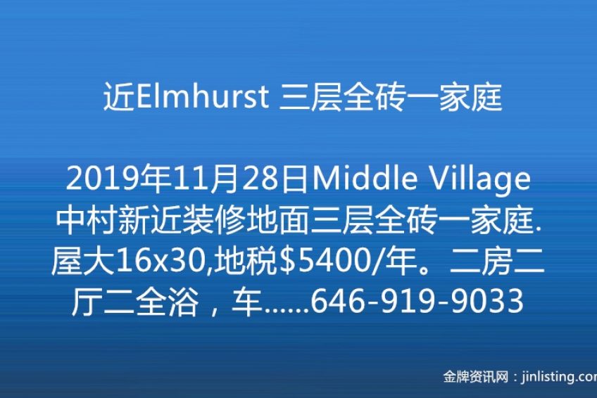 Middle Village 近Elmhurst 三层全砖一家庭 中村新近装修地面三层全砖一家庭. 屋大16×30,地税$5400/年。二房二厅二全浴,车库私家车道大后院,好学区温馨自住房。交通便利。售$74万。call Cindy Chen 646-919-9033