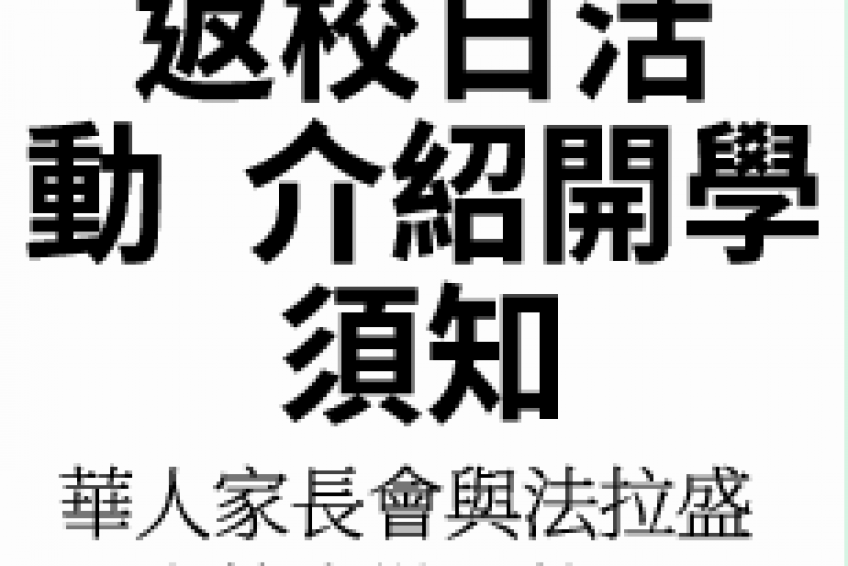 ● 下午2點,華人家長會會長黃德望將向家長們講解如何幫助孩子迎接新學年、學生和家長應如何與老師溝通、學校的防疫政策和返校的小知識(理事會主席朱寶玲將提供中文翻譯);