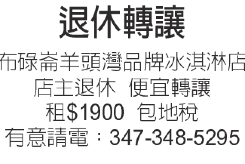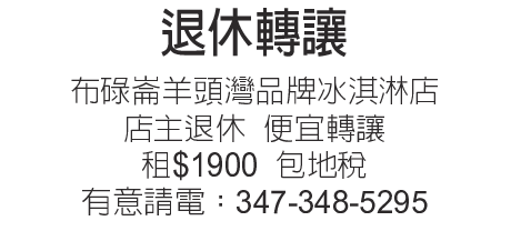 布碌崙羊頭灣品牌冰淇淋店,店主退休便宜轉讓,租$1900包地稅,有意請電:347-348-5295
