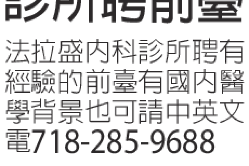 法拉盛內科診所聘有經驗的前臺,有國內醫學背景也可, 中、英文。 電:718-285-9688
