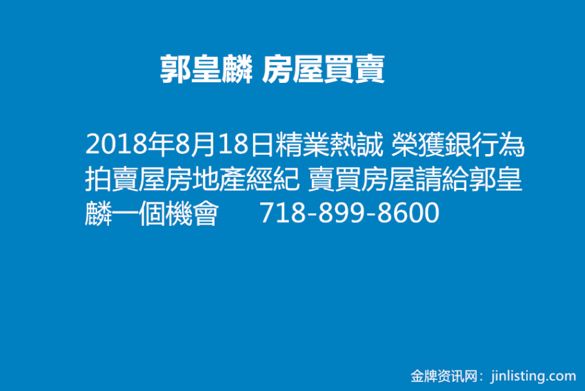 郭皇麟 HUANG L.KUO 做什麼 . 像什麼 Team 24小時服務 718-899-8600,718-429-4400 精業熱誠 榮獲銀行為拍賣屋房地產經紀 賣買房屋請給郭皇麟一個機會 LREALESTATESAL