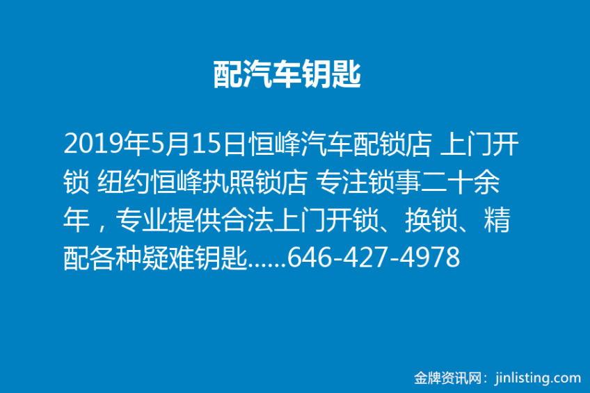配汽车钥匙 恒峰汽车配锁店 上门开锁 纽约恒峰执照锁店 专注锁事二十余年,专业提供合法上门开锁、换锁、精配各种疑难钥匙及感应电子钥匙、配汽车智能遥控钥匙、芯片钥匙、汽车钥匙全丢做钥匙、汽车遥控钥匙壳破损翻新,各种汽车遥控器电池。地址:41-31 Main st Flushing ny11355. 电话:646-427-4978