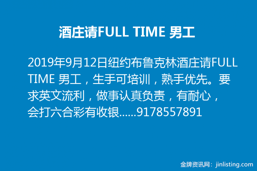 “纽约布鲁克林酒庄请FULL TIME 男工,生手可培训,熟手优先。要求英文流利,做事认真负责,有耐心,会打六合彩有收银经验的优先。店址位于3号地铁线,可以自己开车上下班最好,住法拉盛的必须自己开车上下班(坐地铁不方便),本店待遇好,工资高3500-4000。 有意者请联系Terry. 之前已经打过电话咨询的朋友如果还有意向,可以再和Terry联系. call/text 9178557891 注:广告勿扰!!!!!!!”