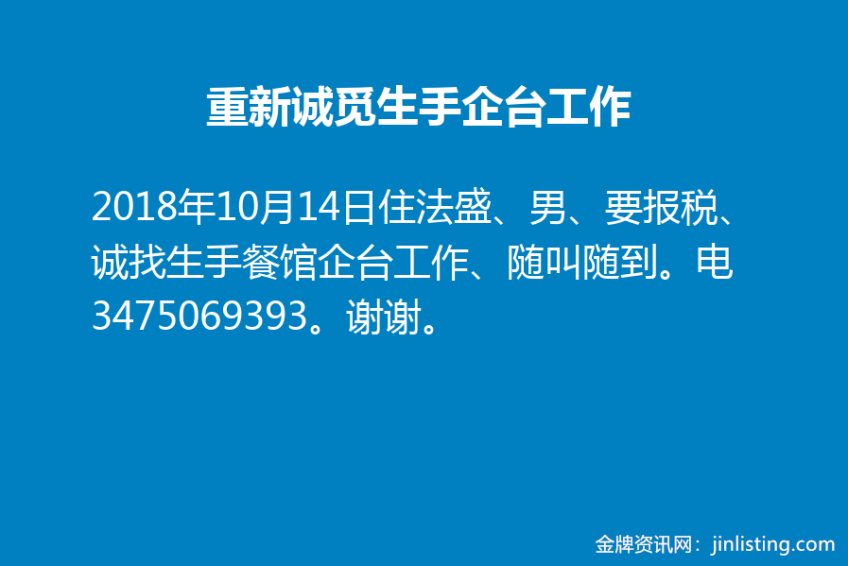 住法盛、男、要报税、诚找生手餐馆企台工作、随叫随到。电3475069393。谢谢。