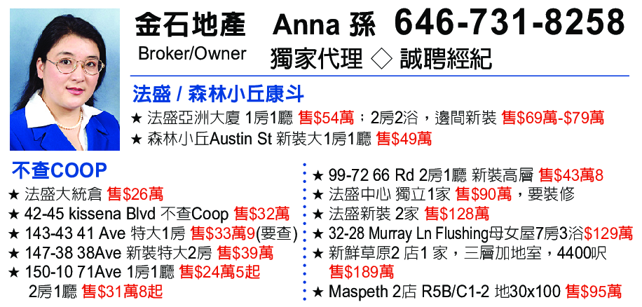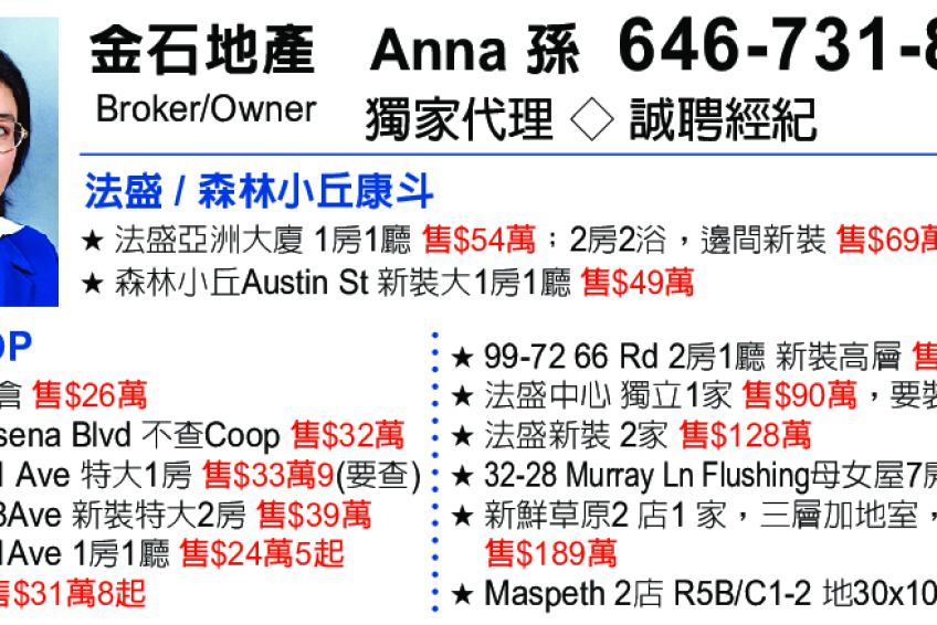 孙小姐–金石 646-731-8258 goldhome888@yahoo.com