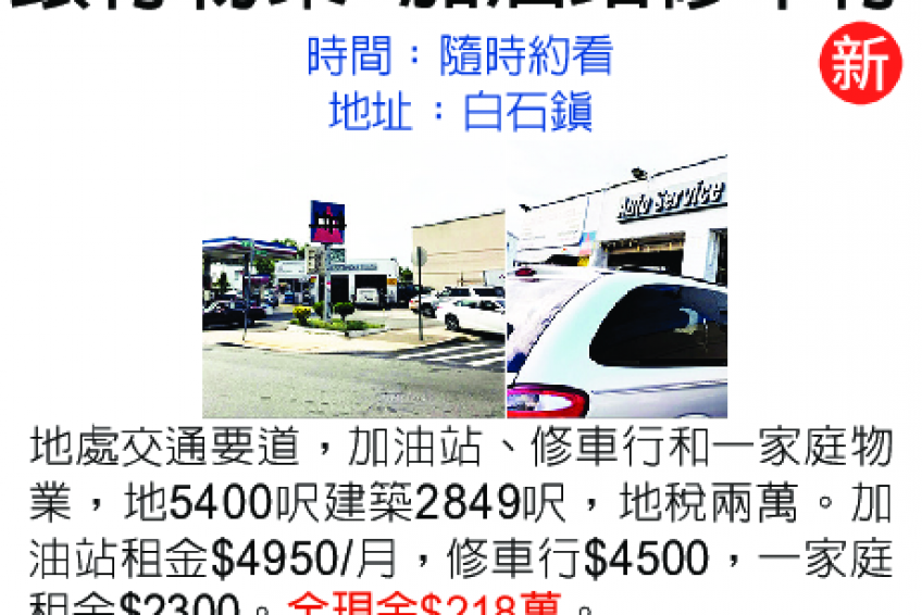 地處交通要道,加油站、修車行和一家庭物業,地5400呎建築2849呎,地稅兩萬。加油站租金$4950/月,修車行$4500,一家庭租金$2300。全現金$218萬。
