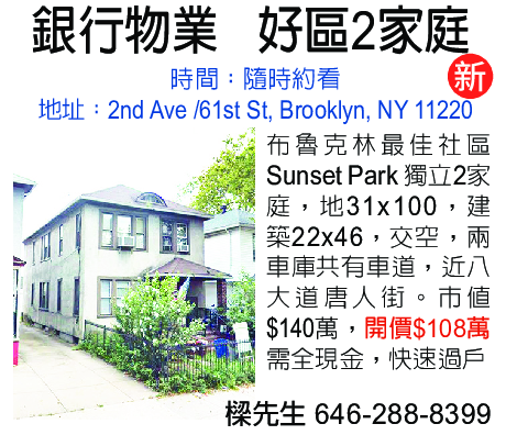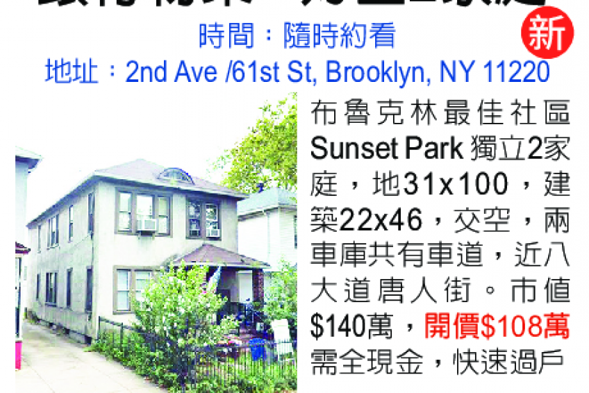 布魯克林最佳社區Sunset Park獨立2 家庭 ,地31X100,建築22X46, 交空,兩車庫共有車道,近八大道唐人街。市值140萬,開價108萬,需全現金。快速過戶。