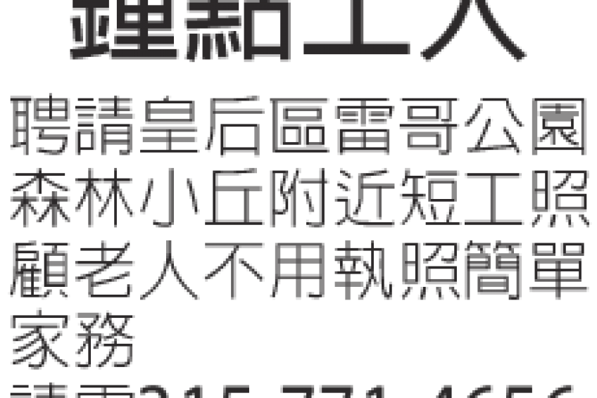 聛請: 皇后區,雷哥公園,森林小丘附近短工,照顧老人,不用執照,簡單家務,意者請電3157714656