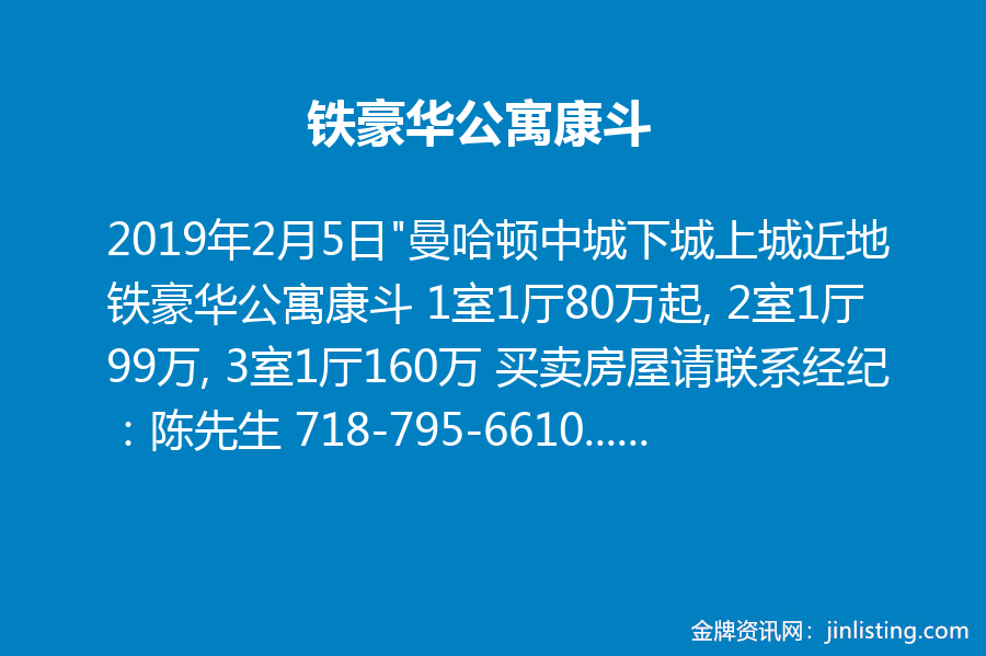 “曼哈顿中城下城上城近地铁豪华公寓康斗 1室1厅80万起, 2室1厅99万, 3室1厅160万 买卖房屋请联系经纪:陈先生 718-795-6610, keeptohope@gmail.com”
