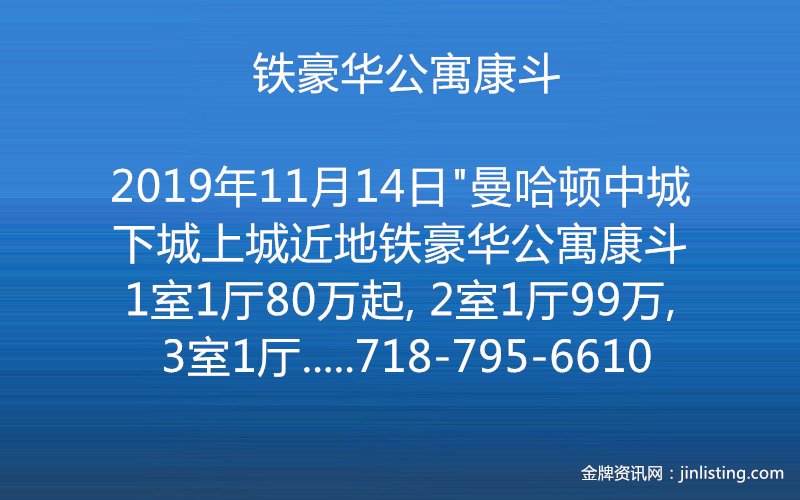 “曼哈顿中城下城上城近地铁豪华公寓康斗 1室1厅80万起, 2室1厅99万, 3室1厅160万 买卖房屋请联系经纪:陈先生 718-795-6610, keeptohope@gmail.com”