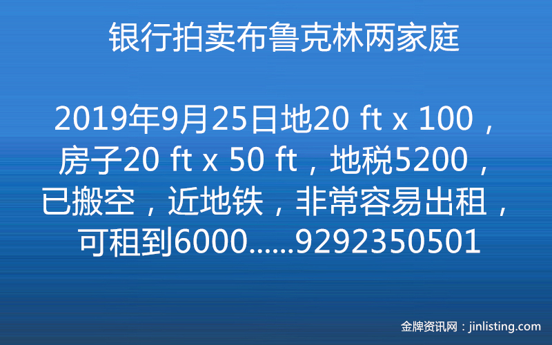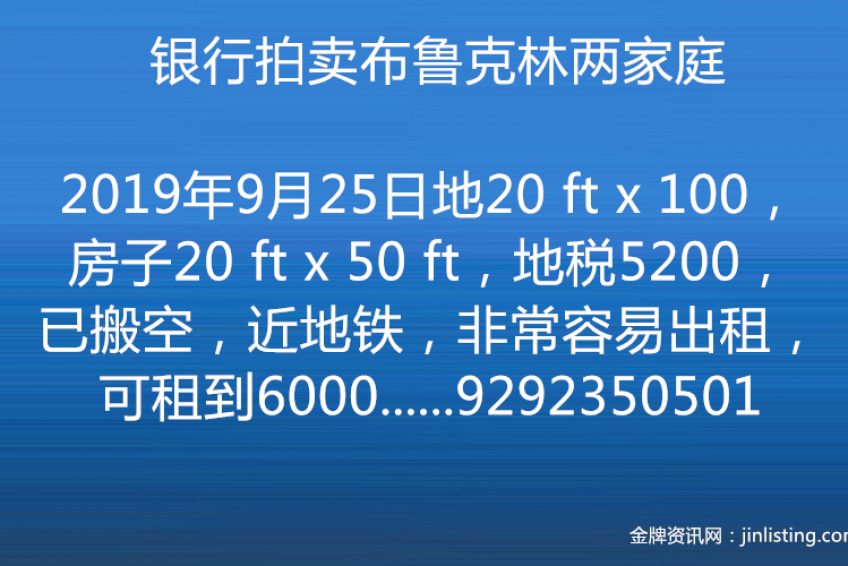 银行拍卖布鲁克林两家庭:地20 ft x 100,房子20 ft x 50 ft,地税5200,已搬空,近地铁,非常容易出租,可租到6000,需全现金快速过户。仅售$66万全现金,市场价值85万以上、电话9292350501方小姐