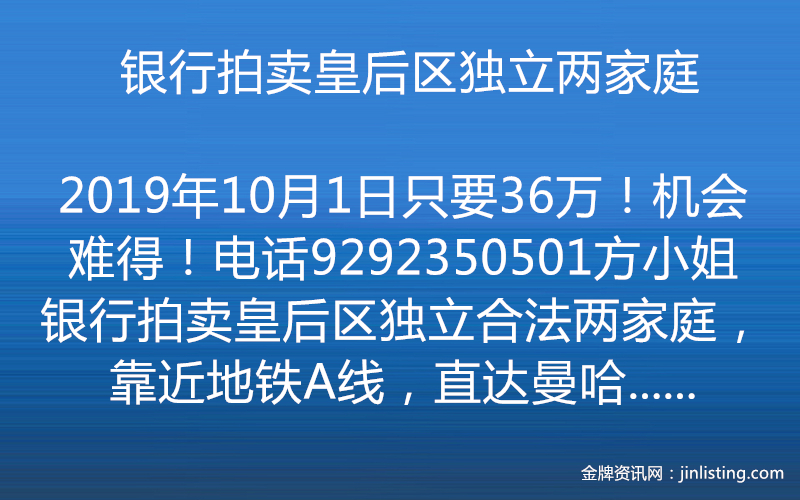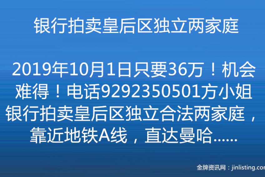 银行拍卖皇后区独立两家庭只要36万!机会难得!电话9292350501方小姐 银行拍卖皇后区独立合法两家庭,靠近地铁A线,直达曼哈顿,地30×86,房16×35,建筑面积1254尺,地税$2048,仅售$36万全现金不讲价,房子状况良好,里面不用装修,只能看外面