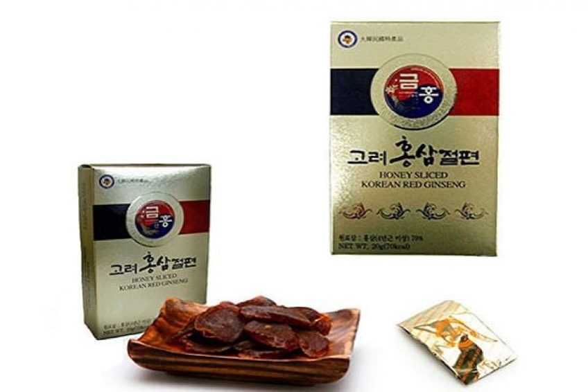 将多年生高丽人参加工成红参以后,添加蜂蜜,制做成色香味俱佳的红参切片,食用时更方便,口感味道俱佳。