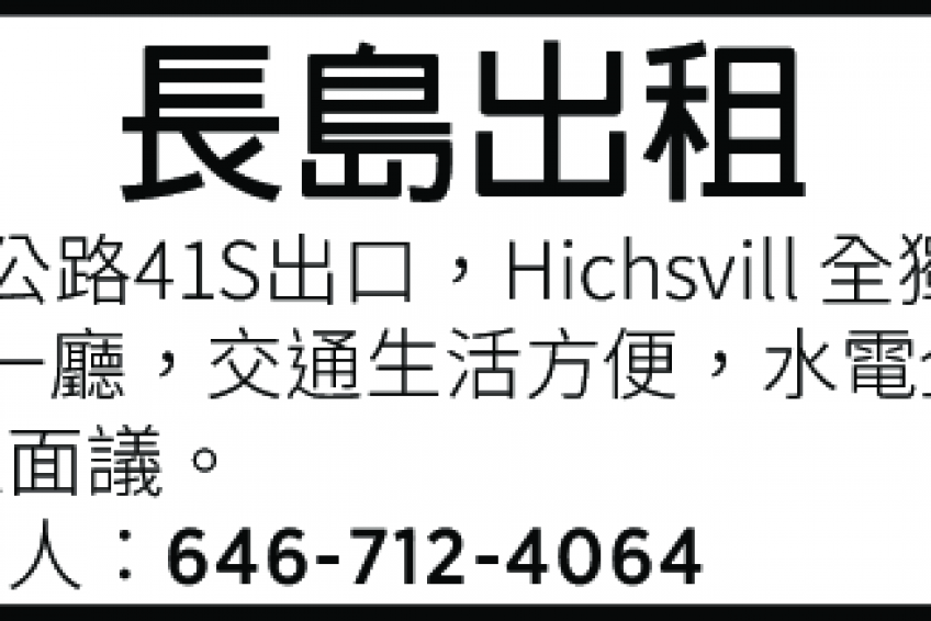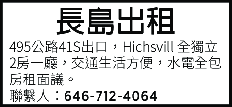 495公路41S出口,Hichsvill,全獨立,兩房一廳,交通生活方便,水電全包,房子面議 646-712-4064