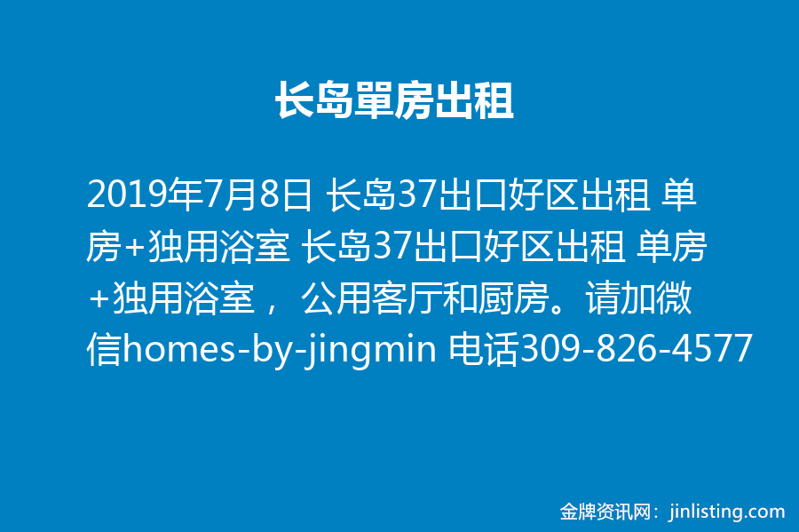 长岛37出口好区出租 单房+独用浴室 长岛37出口好区出租 单房+独用浴室, 公用客厅和厨房。请加微信homes-by-jingmin 电话309-826-4577