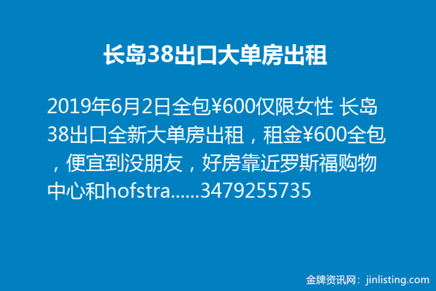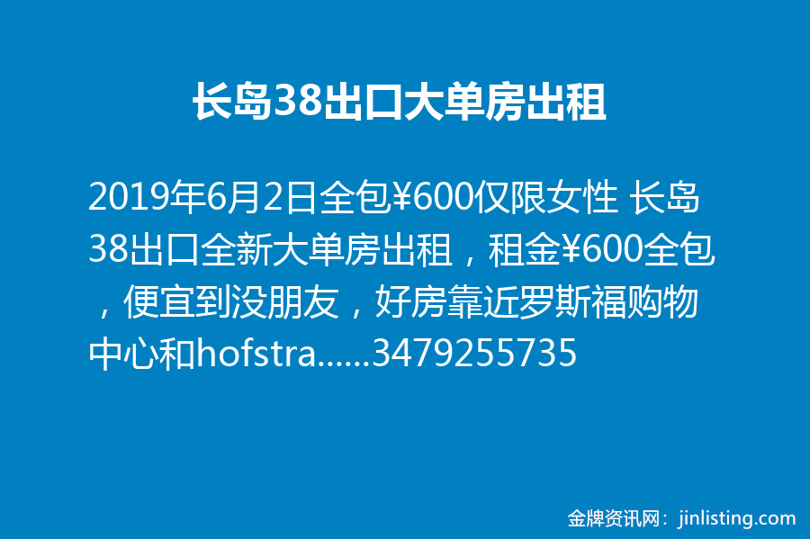 长岛38出口大单房出租全包¥600仅限女性 长岛38出口全新大单房出租,租金¥600全包,便宜到没朋友,好房靠近罗斯福购物中心和hofstra 大学,适合母女、姐妹或上班族女性,有意者请电3479255735