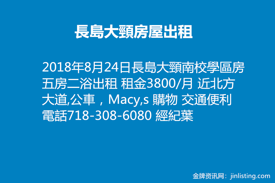 長島大頸南校學區房,五房二浴出租,租金3800/月。近北方大道,公車,Macy’s 購物。交通便利,環境優美,馬上入住。電話718-308-6080 經紀葉