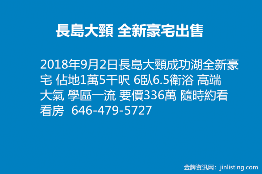 时间:随时约看 地址:Great Neck,NY 長島大頸成功湖全新豪宅,佔地1萬5千呎, 室內面積5500呎, 6臥6.5衛浴,西人建築,高端大氣, 學區一流。要價 336萬。 隨時約看。 看房熱線: 646-479-5727.