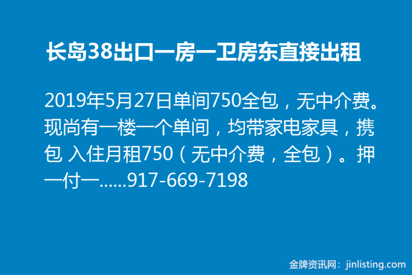 长岛38出口一房一卫房东直接出租,单间750全包,无中介费。现尚有一楼一个单间,均带家电家具,携包 入住月租750(无中介费,全包)。押一付一。 房间整洁,安全,清静,采光好。 靠近霍夫大学,38Mall丶大型超市costco,home depot丶中餐馆丶新飞龙超市,火车站,均开车 十分钟之内车程,生活便利。 周边学校好,小学 十分学区。初中高中为九分学区。 随时可看房! 有意者电话联系房东本人: rex阿雷,917-669-7198。 适合单身男,女,学生。亦可以每月短租。每周短租费用为二百四十五 美金(每天三十五美金,全包)。”