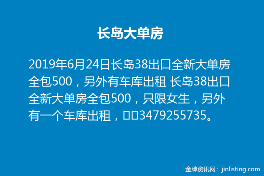 长岛38出口全新大单房全包500,另外有车库出租 长岛38出口全新大单房全包500,只限女生,另外有一个车库出租,☎️3479255735。